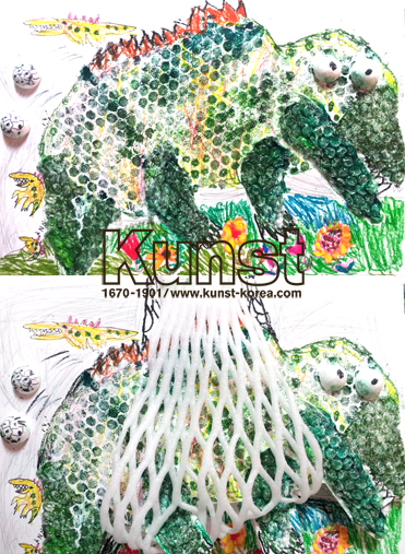 가은이는 주위에서 쉽게 만나볼 수 있는 재료에 본인의 재미를 반영하여 덫에 걸려 깜짝 놀란 악어를 그려주었습니다. 뽁뽁이에 연두, 진청 등 녹색계열의 물감 묻혀 스케치북에 찍어내어 울퉁불퉁한 악어의 껍질을 표현하였고, 같은 그린톤이지만 크레파스의 선적인 효과와 화사한 꽃, 풀밭을 함께 그려주어 보다 생기있는 화면구성을 연출해 주었습니다. 서초지사_노가은(6세)