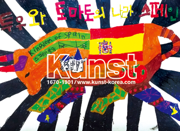 청주흥덕지사의 재희는 Kunst Travel 수업을 하며 스페인의 다양한 문화와 역사를 배워보며 투우와 토마토의 나라인 스페인을 그려주었습니다. 소 위에는 스페인 국기를 관찰하여 섬세하게 표현하였고, 다양한 칼라패턴의 느낌이 흑백 줄무늬 배경과 대비되어 주제물에 시선을 집중시킨 화면구성이 돋보입니다. 청주흥덕지사_신재희(10세)