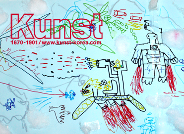 하늘을 나는 다양한 모양의 로봇들이 서로 전투를 벌이고 있습니다. 솜을 이용하여 입체감있는 구름을 표현한 오브제 사용과 하늘빛 색지 위에 알록달록한 사인펜으로 그린 로봇들의 디테일한 표현이 재미있습니다. 그림에 규칙을 갖기보다는 자신이 좋아하는 주제로 스토리를 이끌어내어 자신감있게 그려준 모습이 기특합니다. 일산지사_김율언(8세)