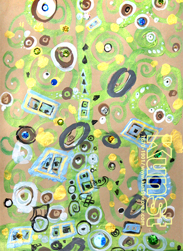 구스타브 클림트의 [생명나무]는 유리, 산호, 자개, 보석 등 다양한 재료를 사용한 추상적인 형태가 특징입니다. 현수는 작품을 응용해보며, 경쾌하고 음율감있는 나무의 곡선이 다양한 패턴과 어우러지게 클림트의 감성을 잘 표현하였습니다. 소포지 위에 녹색과 금색 물감, 곡선과 사선, 기하학적인 도형들이 조화를 이루며 멋진 화면을 구성한 작품입니다. 해운대지사_김현수(10세)