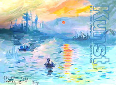 나경이는 클로드 모네의 삶과 작품세계를 배워보고 대표작인 [해돋이.1872] 모작을 통해 표현의 폭을 넓혀보는 시간을 가졌습니다. 검정색을 많이 쓰지 않고 빛과 그림자의 효과로 주위의 모습을 표현했던 모네처럼 나경이도 하늘색과 노란색을 조화롭게 사용하였으며 크고 작은 붓터치를 활용하여 감각적인 화면을 구성했습니다. 목동양천지사_홍나경(8세)