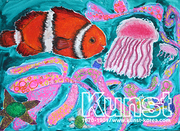 영등포지사의 현진이는 NATURAL & SCIENCE 수업을 하며 유유자적 헤엄치는 해파리, 붉은 색의 니모, 별모양의 불가사리를 자유롭게 표현해 주었습니다. 밝은 컬러의 다양한 생물들이 에메랄드 색의 바다배경과 대비되어 돋보이는 화면구성을 보여줍니다. 실제 바닷 속을 상상해보게 만드는 현진이의 작품입니다. 영등포지사_남현진(8세)
