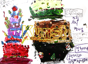 광주지사의 경원이는 WALDORF KINDERGARTEN 수업을 하며 경원이네 궁전제과점의 주인이 되었습니다. 다양한 색의 물감으로 층층이 쌓아올린 높은 딸기맛 케익과 생일축하용 크림맛 3단 컵케익, 1단 초코맛 컵케익을 자유롭게 그려주고, 값도 정해주었습니다. 빵이 나오는 시간도 10시로 설정하며, 실제 제과점을 상상하게 하는 구체적인 스토리와 물풀을 활용한 화면구성이 돋보이는 작품입니다. 광주지사_장경원(8세)