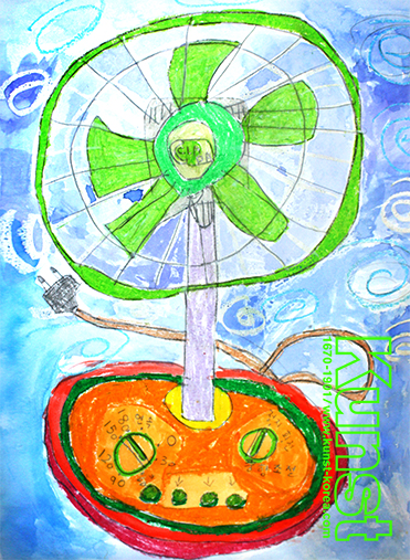 영등포지사의 상비는 KUNST KINDHEIT 수업을 하며 집에서 흔히 볼 수 있는 선풍기를 관찰하고, 세밀하게 표현해 보았습니다. 선풍기의 본체와 날개, 타이머와 강중약 버튼 등을 하나하나 그려준 집중력과 관찰력이 돋보이는 작품입니다. 원색적인 선풍기와 바람이 불고 있는 것 같은 회오리 패턴의 하늘색 배경이 함께 어우러져 사물의 느낌을 잘 나타내주었습니다. 영등포지사_황상비(7세)