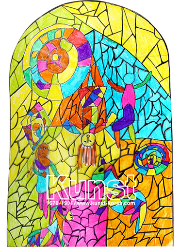 한아는 마르크 샤갈의 삶과 작품세계를 함께 배워보고, 자신의 그림으로 응용해 보았습니다. 성경을 주제로 한 수많은 스테인드 글라스 작품을 그린 화가를 따라, 한아도 OHP필름 위에 사인펜을 이용하여 자신만의 스테인드 글라스 작품을 그려주었습니다. 창문모양의 틀 안에 다양한 모습의 인물과 동물, 조각으로 이루어진 배경 등을 다채롭게 표현한 한아의 작품입니다. 광주지사_최한아(12세)