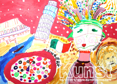 쿤스트 광주지사의 예성이는, KUNST TRAVEL 이미지 여행을 통해 이탈리아의 다양한 모습들을 한 화면 안에 다채롭게 표현해주었습니다. 깔끔하게 정돈된 개체 표현과 강렬한 컬러감이 돋보이며 부분부분 포인트를 준 도트무늬가 매력적인 작품입니다. 광주지사_윤예성(10세)