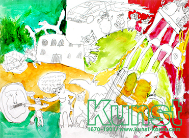 청주흥덕지사의 우진이는 KUNST TRAVEL을 통해 이탈리아를 여행해 보았습니다. 기울어진 피사의 사탑과 콜로세움, 진실의 입을 단순히 형태를 그리는 것만이 아닌 다양한 동물과 스토리를 엮어서 재미있게 표현해 주었습니다. "진짜로 내 고기를 안훔쳐먹었다면 저기에 손을 넣어봐!" "살려줘!" 라고 말하고 있는 동물들의 모습이 미소를 자아냅니다. 청주흥덕지사_이우진(11세)