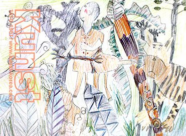 광주서구지사의 환의는 KUNST KINDER MUSEUM 수업을 하며 앙리루소의 삶과 작품세계에 대해 배워보았습니다. 현실세계에서는 보기 힘든 다양한 동식물을 자유롭게 상상하여 표현했습니다. 우거진 정글의 모습을 드로잉한 후, 색연필의 부드럽고 가는 선으로 섬세하게 채색하여, 강렬한 색을 많이 썼던 앙리 루소의 작품들보다 서정적인 느낌을 주는 작품입니다. 광주서구지사_최환의(9세)