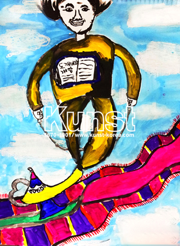 목동양천지사에서 수업받고 있는 승빈이가 Think&Creative 에서 3가지 소원을 생각해보고 표현하였습니다. 길쭉~ 키가 커지고 줄넘기도 잘하고, 공부도 잘하고 싶은 승빈이가 알라딘의 요술램프에서 뿅! 하고 나타나는 모습을 재미있게 그렸습니다. 스케치를 하지 않고 붓으로 슥슥 자신의 생각을 그려낸 승빈이, 선명한 색감의 대비가 돋보입니다. 목동양천지사_이승빈(10세)