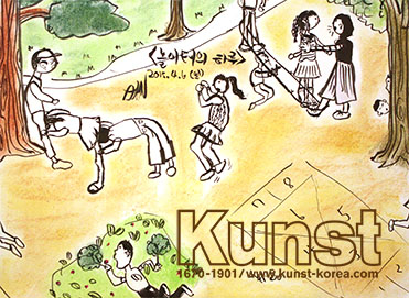 일산동구의 소연이는 NATURAL & SCIENCE 수업을 하며 놀이터의 모습을 표현해 보았습니다. 놀이터의 하루라는 주제로 사람들이 다양한 놀이를 하고 있어요. 배경을 가득 채색해주고, 인물묘사는 선드로잉으로 표현한 기법이 돋보이며 사실감있고 활동적인 일상의 이야기가 재미있는 작품입니다. 일산동구지사_안소연(10세)