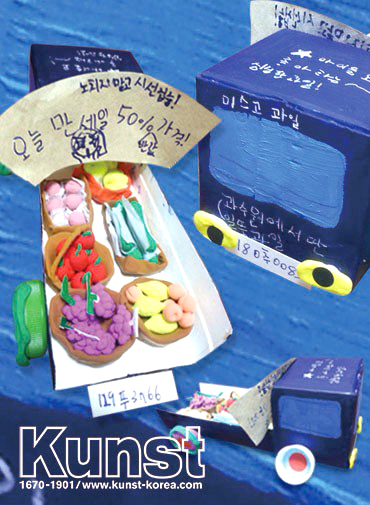광주서구지사의 태영이는 KUNST MAKE & PLAY 수업을 하며 과일을 파는 트럭을 만들어 주었습니다. 우유곽과 병뚜껑으로 만든 트럭 안에는 맛있는 과일들이 잔뜩 실려있어요. 태영이의 이름을 딴 '미스고 과일' 트럭에 적혀 있는 '놓치지 말고 시선집중! 오늘만 50% 반값 가격! 아이들도 좋아하는 싱싱한 과일! '등의 문구가 미소를 자아냅니다. 광주서구지사_고태영(12세)