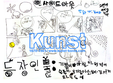 용산지사의 서하는 WALDORF KINDERGARTEN 수업을 하며 만화가가 되어보았습니다. 영화 [인사이드아웃]을 떠올려보고 등장인물의 성격을 반영하여, 서하만의 이야기로 각색하였습니다. 새로운 감정캐릭터인 부러움이도 등장하여 재미를 더합니다. 용산지사_김서하(8세)
