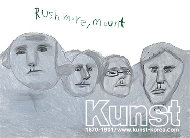 쿤스트 상당지사의 지욱이는 KUNST TRAVEL을 통해 미국의 러슈모어 산을 그려보았어요. 조지 워싱턴, 토머스 제퍼슨, 시어도어 루스벨트, 에이브러햄 링컨까지 대통령 한사람 한사람의 이목구비 특징을 잘 반영하여 표현해 주었습니다. 청주상당지사_김지욱(11세)