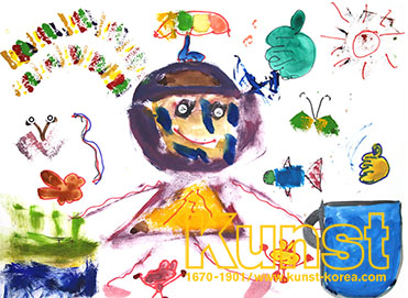 청주상당지사의 하윤이는 WALDORF KINDERGARTEN 수업을 하며, 스펀지를 콕콕찍어 귀여운 아이와 무지개를 표현해 보았어요. 배경에는 펜과 물감을 활용하여 나비와 토끼, 해도 그려보며 사랑스러운 장면을 완성했습니다. 청주상당지사_노하윤(8세)