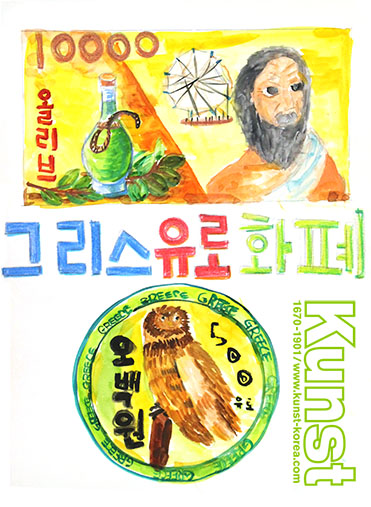 청주청원지사의 유나는 KUNST TRAVEL을 통해 그리스를 여행해보고, 그리스의 특징적인 이미지들을 활용하여, 화폐형식으로 표현해 보았습니다. 그리스의 특산물, 인물 등의 소재를 이해하고 글과 함께 하나의 이미지로 조화롭게 표현한 방식이 재미있습니다. 청주청원지사_이유나(12세)