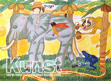 대전서구지사의 영진이는 THINK & CREATIVE 수업을 하며 무인도에 가게 된다면 일어날 수 있는 일에 대해 상상해보고 그려보았습니다. 커다란 코끼리 위에 두 팔을 축 내린 채 집에 가고 싶어 하는 영진이의 모습과 코끼리 뒤에서 코코넛을 들고 약 올리는 듯 따라오는 원숭이, 푸른색 개구리와 뱀, 야자수 등을 함께 구성해주며 야생적인 무인도 느낌을 표현해 주었습니다. 대전서구지사_탁영진(11세)