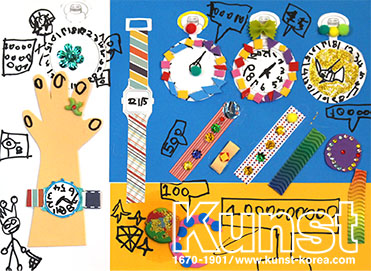 충주지사의 기율이는 KUNST KINDHEIT 수업을 하며 멋진 시계들을 표현해 보았습니다. 손목에 직접 찬 손목시계 전자시계, 목걸이시계 등 다양한 종류의 시계를 펠트조각, 반짝이풀, 마카로니, 골판지, 스티커 등의 각종 꾸미기 재료와 숫자 드로잉을 활용하여 재미있게 구성해주었습니다. 충주지사_남기율(7세)