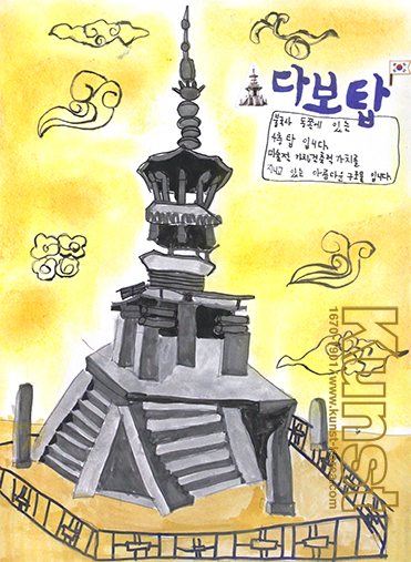 노원지사의 준희는 KUNST TRAVEL 을 통해 우리나라 곳곳의 문화와 다양한 유적지를 여행해보고 통일신라 석조미술의 백미인 국보 제20호 불국사 다보탑을 표현해 주었습니다. 다양한 모양과 크기의 석조들을 섬세하게 관찰해보고, 다보탑의 건축적인 특징을 잘 표현한 작품입니다. 노원지사_이준희(10세)
