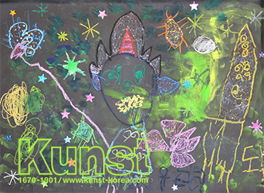 용인수지지사의 도율이는 KUNST KINDHEIT 수업을 하며 어두운 밤에 생긴 일을 검은 색지 위에 자유롭게 표현해 주었습니다. 반짝이는 뿔이 달린 도깨비처럼 보이는 주인공과 그 주위의 형형색색 빛나는 개체들이 어두운 밤을 밝혀 주고 있습니다. 반짝이풀과 크레파스, 스티커의 자유로운 구성이 몽환적인 느낌을 자아내는 작품입니다. 용인수지지사_이도율(6세)