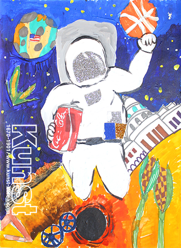 마산회원구지사의 재원이는 KUNST TRAVEL를 통해 미국의 문화와 역사, 유적지 등을 여행해보고 인상 깊었던 소재들을 하나의 화면으로 구성하였습니다. 코카콜라를 든 NASA의 우주복을 입은 사람을 중심으로 농구, 국회의사당 등을 배경적인 요소로 재미있게 표현한 작품입니다. 마산회원구지사_이재원(9세)