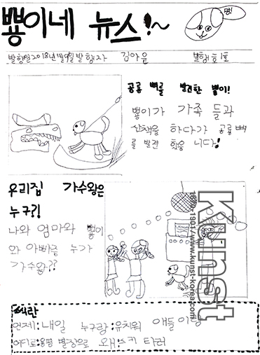 강남지사의 아윤이는 EVERYDAY & EVERYART 수업을 하며 가족신문을 만들어 보았습니다. 아윤이가 발행한 [뿅이네 뉴스]에는 공룡 뼈를 발견한 뿅이, 우리집 가수왕은 누구?! 라는 기사가 실려 있습니다. 간단한 드로잉과 글을 적절하게 활용하여 신문형식으로 구성해본 아윤이의 작품입니다. 강남지사_김아윤(9세)