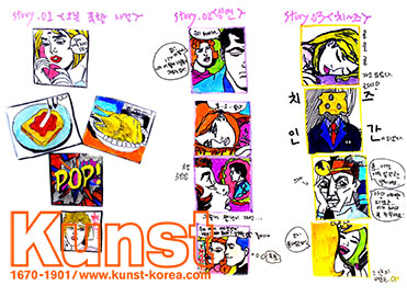 광명지사의 유정이는 KUNST KINDER MUSEUM 수업을 하며, 앤디 워홀, 리히텐슈타인 등 팝 아티스트의 삶과 작품세계를 배워보고, 재미있는 이야기를 구성해 주었습니다. OHP필름 위에 채도 높은 매직펜으로 그린 생동감 있는 인물 표현과 말풍선의 팝아트적 표현이 감각적인 작품입니다. 광명지사_지유정(14세)