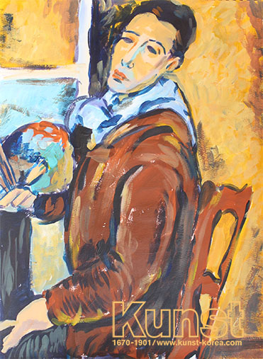 대전유성구지사의 강민이는 KINDER MUSEUM 수업을 통해 모딜리아니의 삶과 작품세계를 배워보고, [자화상,1919]을 모작해보았습니다. 긴 형태의 얼굴과 우수 젖는 눈빛, 살짝 자세를 틀고 의자에 앉아 부채를 들고 있는 모습 등 원작 속 인물의 특징과 분위기를 잘 나타내준 작품입니다. 대전유성구지사_성강민(12세)