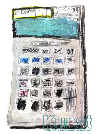 강동지사의 윤재는 KUNST KINDHEIT 수업을 하며 일상에서 볼 수 있는 주변 사물인 계산기를 관찰해보고 드로잉해 보았습니다. 큰 직사각형 형태 안 수많은 작은 사각형들과 그 위의 숫자들, 숫자가 나오는 전자판 등을 연필과 펜, 크레파스 등을 활용하여 표현해 주었습니다. 계산기의 특징이 잘 나타나게 드로잉해준 작품입니다. 강동지사_박윤재(7세)