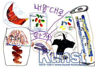 광주지사의 윤성이는 KUNST KINDHEIT 수업을 하며 먹고 싶은 과자들을 내맘대로 한가득 만들어 보았습니다. 커다란 초코송이와 작고 귀여운 젤리빈, 포도맛 사탕, 독수리 캔디, 반짝이는 빼빼로 등 다채로운 표현과 재미있는 발상이 돋보이는 작품입니다. 광주지사_조윤성(7세)