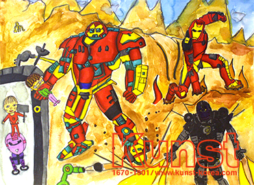 청주흥덕지사의 연웅이는 THINK & CREATIVE 수업을 통해 TV속 한 장면을 표현해 보았습니다. 멋진 모습으로 등장한 아이언맨의 앞에는 친구 제임스 로디도 보입니다. 마블 영화 속 주인공들의 세부적인 묘사와 동세, 재미있는 이야기가 돋보이는 작품입니다. 청주흥덕지사_장연웅(12세)