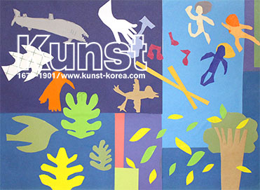 청주흥덕지사의 종욱이는 KUNST KINDER MUSEUM 수업을 하며, 앙리 마티스의 삶과 작품세계를 배워보았습니다. 색종이로 식물과 인물을 단순화한 형태로 오려 자유롭게 표현한 작품으로 바닷속이 연상되는 푸른 계열 배경 위의 난색 계열 오브제 구성이 감각적인 작품입니다. 청주흥덕지사_이종욱(10세)