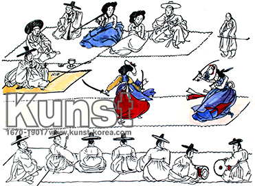 성동지사의 은하는 KUNST HISTORY & CLASSIC 수업을 하며 신윤복의 [혜원 전신첩] 풍속화 중 하나인 [쌍검대무]를 모작해 주었습니다. 양반들과 장악원의 악공들, 검무하는 기생들의 모습을 붓펜으로 생동감 있고 섬세하게 묘사한 후, 부분 채색으로 주요 인물들을 더욱 강조하여 표현하였습니다. 성동지사_장은하(18세)
