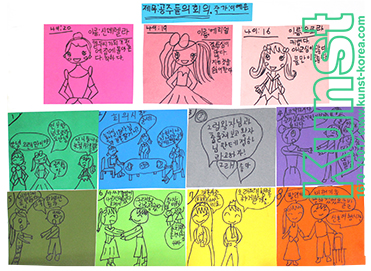 청주흥덕지사의 예은이는 KUNST WALDORF KINDERGARTEN 수업을 하며, 공주들의 회의라는 주제의 만화를 그려주었습니다. 먼저 상단에는 등장인물인 신데렐라, 에리얼, 오로라 공주의 나이, 성격, 생김새 등을 소개한 후, 하단에는 누가 이웃 나라 왕자님과 결혼할 것인지 회의하는 재미있는 이야기를 8컷의 만화로 구성한 스토리텔링 능력과 드로잉 감각이 돋보이는 작품입니다. 청주흥덕지사_이예은(8세)