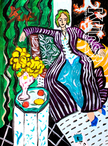 용인수지지사의 연우는 KUNST MUSEUM 수업을 하며 마티스의 삶과 작품세계를 배워보고, [보라색 옷을 입은 여인과 미나리아재비,1869]을 모작해 보았습니다. 테이블 위의 노란 꽃과 과일, 목걸이를 장식하고 있는 금발의 여인, 화면을 구성하는 화려한 무늬 등 원작의 특징을 잘 반영하여 표현한 작품입니다. 용인수지지사_김연우(14세)