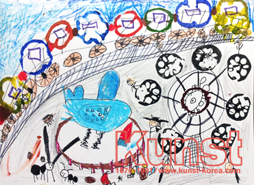 과일과 야채의 단면을 다양하게 찍어보고 그를 응용하여, 가은이의 추억 속 대관람차, 비행기, 기차모양의 즐거운 놀이동산을 완성해주었습니다. 가은이는 각 놀이기구를 구조적으로 관찰해보며, 적절한 재료 활용으로 독창적인 드로잉선과 절제된 배색으로 창의력있게 표현하였습니다. 서초지사_ 노가은(5세)