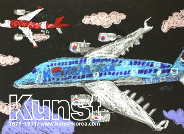 마산회원구의 준우는 KUNST FACTORY 수업을 통해 검정 사포지에 비행기를 그려보았습니다. 대한항공 로고와 태극마크가 섬세하게 묘사된 푸른빛의 대한항공 여객기가 감각적인 작품입니다. 마산회원구지사_박준우(9세)