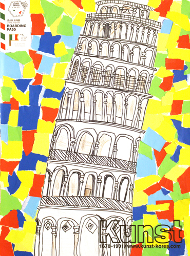 강남지사의 승호는 KUNST TRAVEL 수업을 하며 이탈리아의 피사의 사탑을 그려보는 시간을 가졌습니다. 피사의 사탑의 외관을 관찰한 뒤 펜으로 섬세하게 묘사해주고 배경에 알록달록 색종이를 붙여 멋진 장면을 완성해주었습니다. 강남지사_지승호(9세)