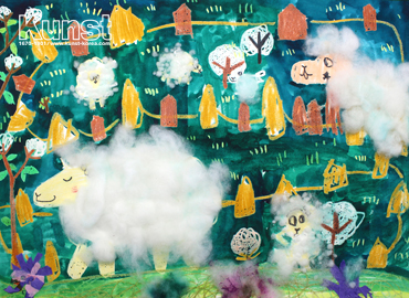 대전서구지사의 주아는 WALDORF KINDERGARTEN 수업을 하며 솜의 특성과 질감을 활용하여 양의 부드러운 털을 표현해보는 시간을 가졌습니다. 하얀 솜으로 만든 양들을 강조하기 위해 넓은 초원을 짙은 컬러로 채색하고, 울타리에 따뜻한 옐로우 계열의 컬러를 적절히 섞어 차분하면서도 개성 있는 화면을 연출해주었습니다. 대전서구지사_이주아(8세)