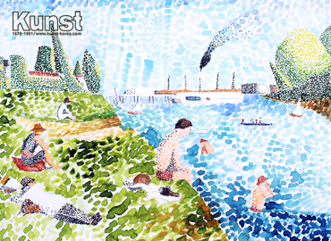 광명지사 상엽이는 KUNST HISTORY & CLASSIC 수업을 통해 조르주 피에르 쇠라의 작품세계를 배워보고, [마니에르 수욕]을 모작해보는 시간을 가졌습니다. 작은 점들을 찍는 방식을 통해 인체를 묘사해준 뒤 두 가지 색을 포개지게 표현하여 풍경에 깊은 음영감을 주었습니다. 당시의 고요하고, 평온한 장면을 상상하게 만드는 작품입니다. 광명지사_김상엽(12세)