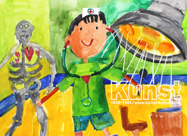 청주청원지사의 하준이는 THINK & CREATIVE 수업에서 아픈 친구를 낫게 할 수 있는 특별한 의사가 되어보는 상상을 해보고 그림으로 표현해보았습니다. 그림 속 병원에는 치료가 필요해 병원을 방문한 해골 친구가 보여요. 일반 병원이 아닌 특별한 환자들이 방문하는 병원을 독특한 상상력으로 재미있게 표현한 작품입니다. 청주청원지사_이하준(9세)