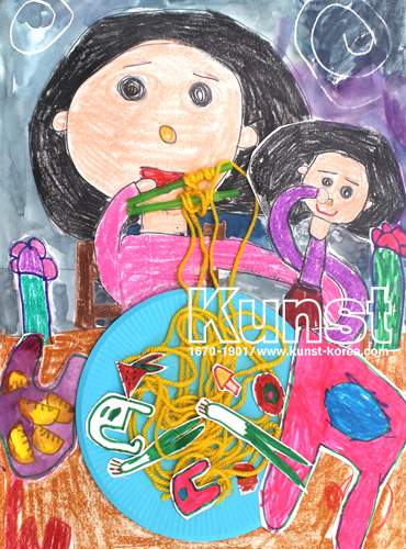 청주청원지사의 효주는 KUNST KINDHEIT 수업에서 두꺼운 털실을 활용하여 맛있는 면 요리를 나타내보았습니다. 접시 위에 구불구불하게 실과 빨대를 붙여 면을 입체감 있게 표현하였으며, 종이에 다양한 식자재를 그리고 오려 토핑을 만들어주었습니다. 크레파스와 물감, 사인펜 등을 다양하게 활용하여 입체적이고 다채롭게 완성한 작품입니다. 청주청원지사_이효주(5세)