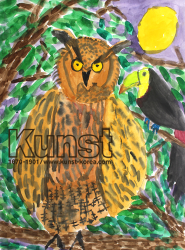 광주지사의 서진는 WALDORF KINDERGARTEN 수업에서 하늘을 날아다니는 멋진 새를 그려보았습니다. 머리 위로 뾰족 나온 귀뿔깃을 표현하여 부엉이의 특징을 잘 묘사하였으며, 수채화로 짧을 붓터치를 만들어 근사한 털의 텍스쳐를 표현하였습니다. 배경 또한 짧은 붓터치로 채색하여 나무 느낌을 잘 표현하면서도 역동성이 느껴지는 강렬한 그림으로 완성해주었습니다. 광주지사_김서진(8세)