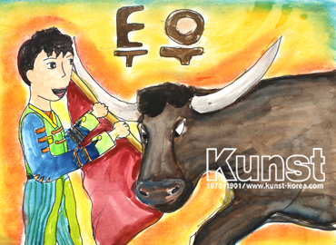 마산회원구지사의 유준이는 KUNST TRAVEL 수업에서 스페인의 특징과 역사에 대하여 배워보고 스페인을 대표하는 문화중에 하나인 투우를 그림으로 표현해보았습니다. 투우사가 착용한 화려한 복장을 디테일하게 묘사하였으며, 커다랗고 큰 뿔을 가진 소를 역동적으로 배치하여 투우 경기의 강렬하고 긴장감 있는 느낌을 효과적으로 표현한 작품입니다. 마산회원구지사_김유준(8세)