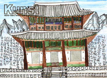 광주지사의 명이는 KUNST TRAVEL 수업에서 우리나라의 전통적인 건축물과 특징을 배워보고 경복궁의 근정전을 수채화로 표현해 보았습니다. 하늘을 지키는 파수꾼인 잡상까지 섬세하게 표현하였으며, 배경에 훈민정음 글귀를 넣어 우리나라의 고유문화유산을 잘 나타낸 작품입니다. 광주지사_선명(12세)