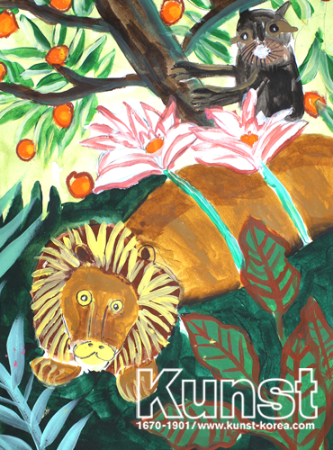 대전동구지사의 서윤이는 KUNST KINDER MUSEUM 수업에서 앙리 루소의 작품을 감상해보고 재해석해보는 시간을 가져보았습니다. 앙리 루소처럼 기둥과 줄기, 잎 등 하나하나 세밀하게 표현하였으며 그의 작품 '열대 폭풍 속의 호랑이'는 이름과 같이 궂은 날씨 속 호랑이를 표현한 반면에 서윤이는 밝은 색상을 활용하여 푸릇푸릇한 과일과 꽃 등 환상적인우림을 표현해주었습니다. 또한, 호랑이가 아닌 사자를 작품 중앙에 배치하여 서윤이만의 작품 해석과 창의적인 기법이 돋보이는 작품입니다. 대전동구지사_이서윤(10세)