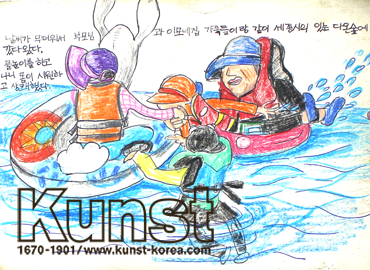 청주청원지사의 지후는 KUNST KINDER MUSEUM 수업에서 이중섭의 작품들을 감상하며 그의 삶을 면밀히 공부해 보는 시간이었습니다. 이중섭은 피난으로 생활고에 못 이기던 아내인 마사코와 두 아들이 일본으로 가게 되면서 가족과 생이별하게 되는 상황에서도 특유의 해학적인 연작을 통해 가족에 대한 그리움을 표현하였습니다. 아이들 연작은 가족의 재회를 꿈꾸며 이상향을 표현한 것으로 따뜻한 정서를 느낄 수 있습니다. 지후는 이중섭 연작 작품에 영감을 받아 가족과의 물놀이를 과감하게 표현하였습니다. 청주청원지사_정지후(10세)