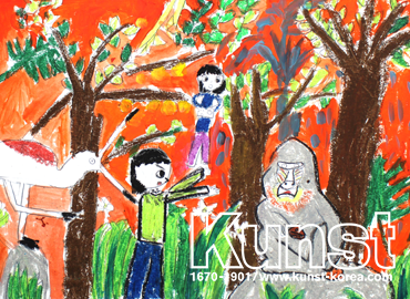 광주서구지사의 민채는 KUNST KINDER MUSEUM 수업에서 앙리루소의 작품 속 이야기들을 통해 민채만의 멋진 정글을 표현해 보았습니다. 앙리 루소가 그려냈던 궂은 날씨 속 초록빛 정글과는 대조적으로 민채만의 활력이 넘치는 명랑한 느낌의 주황빛 정글의 모습이 매우 인상적인 작품입니다. 앙리 루소가 상상 속 정글의 모습을 표현했듯 민채는 상상 속 정글 속에서 동물들과 함께 소통하는 자신의 모습을 표현함으로 더욱 환상적이고 독창적인 작품으로 탄생하였습니다. 광주서구지사_김민채(12세)