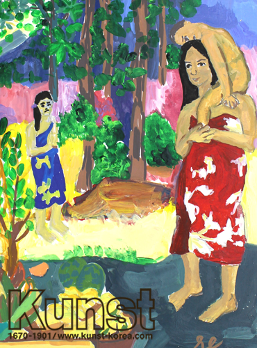 마산회원구지사의 유준이는 HISTORY & CLASSIC 수업을 하며, 폴고갱의 일대기와 작품세계 이해를 통해 (이아 오라나 마리아, 1891)의 일부를 모작해 주셨습니다. 타히티섬의 사람으로 나타낸 성모 마리아와 아기 예수의 섬세한 표정과 동세, 주변 섬의 풍경 등을 조화롭게 표현한 작품입니다. 마산회원구지사_임유준(13세)