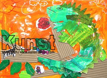 대전동구지사의 서우는 KUNST KINDHEIT 수업에서 빛의 강약과 온도, 감정의 변화에 따라 다양하게 빛깔을 바꾸는 카멜레온을 배워보고 직접 표현해보는 시간이었습니다. 서우는 신비한 모습의 카멜레온을 나뭇잎과 같은 보호색을 띄는 녹색 계열로 칠하고 배경을 주황색을 이용함으로 독창적인 작품으로 탄생하였습니다. 대전동구지사_금서우(6세)