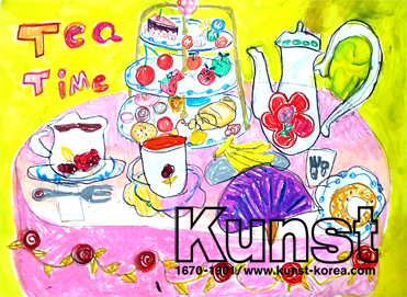 나경이는 kunst travel 수업을 하며 세상을 보는 시각과 흥미를 키워나가는 시간을 가졌습니다. 홍차의 나라, 영국의 티타임 문화를 나경이만의 밝고 따뜻한 느낌으로 사랑스럽게 표현하였습니다. 나경이가 먹고 싶은 쿠키와 과일이 잔뜩 놓여있는 3단 접시와 다양한 모양의 찻잔 드로잉이 다채로운 색감과 함께 어우러져 나경이의 감성이 잘 표현된 작품입니다. 목동양천지사_홍나경(8세)